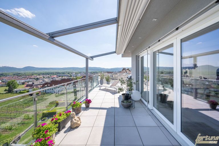 Highlight dieser Wohnung ist die großzügige Dachterrasse mit einem sagenhaften Fernblick über die Stadt, weit entfernte Orte, bis hin zu Stift Göttweig. Großflächige Terrassentüren bzw. bodentiefe Fensterflächen auf drei Seiten gewährleisten direkte Sonneneinstrahlung von Morgens bis Abends. Gleich verhält es sich bei der imposanten Dachterrasse, welche zu jeder Tageszeit zum Sonnenbaden einlädt. Durch Terrassenbrüstungen aus Glas genießen Sie auch sitzend/liegend vom Inneren der Wohnung den weitläufigen Ausblick. Das Gebäude befindet sich direkt an einer Siedlungsgrenze bzw. grenzt an Weingärten im Grünland, welche im...