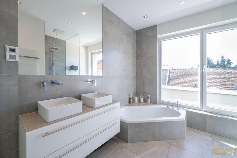 - hochwertige Sanitärausstattung (Unterputzarmaturen, stufenlose Dusche, Eckbadewanne, Handtuchheizkörper, Einbaumöbel, Unterputzradio, etc.)