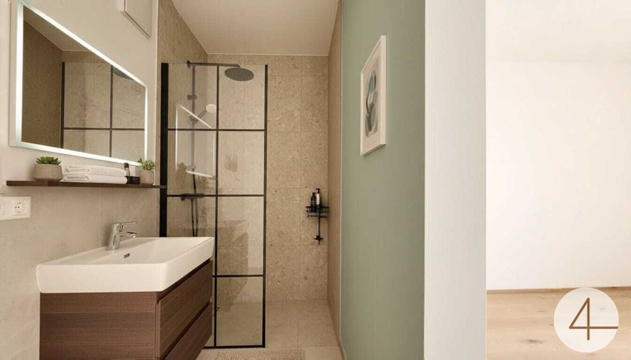 Das Schlafzimmer ist zentral begehbar, das Badezimmer barrierefrei