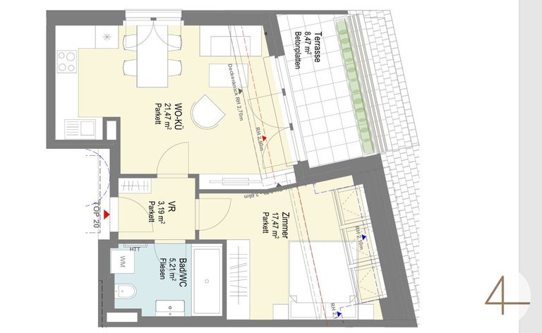 Wohnfläche: ca. 49,56m² Raumaufteilung lt.Plan Vorraum 3,19m² Wohnküche 21,79m² Bad / WC 5,21m² Zimmer 17,47m²