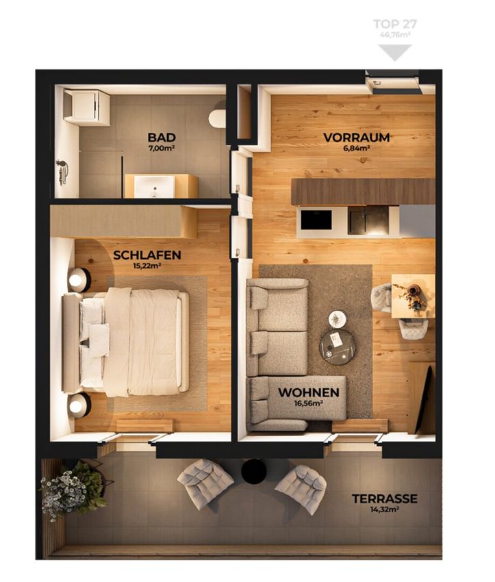 Diese moderne 2-Zimmer-Wohnung in Wörgl vereint Zentrumsnähe, Nachhaltigkeit und Lebensqualität auf ca. 45 m² Wohnfläche plus großzügiger 15 m² Südwest-Terrasse.