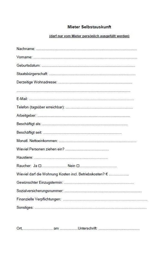 Um die Besichtigungen bestmöglich organisieren zu können, bitten wir alle Interessenten vorab um das Ausfüllen der beigefügten Mieterselbstauskunft.