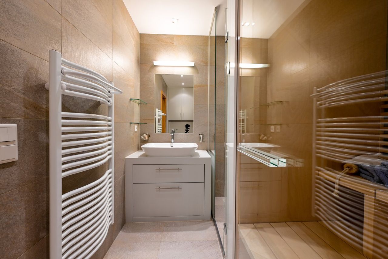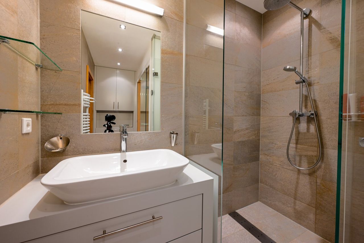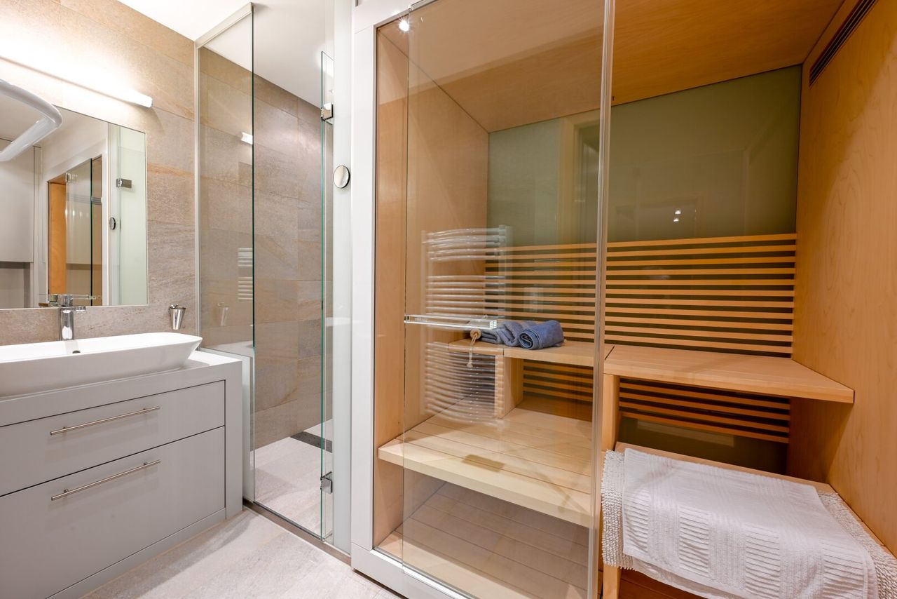 Ein sehr geschmackvoll gestaltetes Bad mit Fenster, Erlebnisdusche, Waschtisch und dem großen Highlight - einer Sauna, runden das Angebot ab. Das WC ist extra angeordnet.
