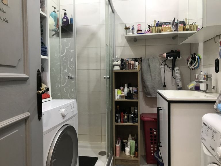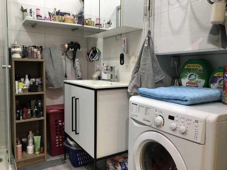 - Helles Badezimmer mit Dusche, WC und Waschmaschinenanschluss