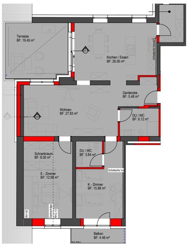 • Balkon ca. 4,46 m² und Terasse ca. 19,45 m²