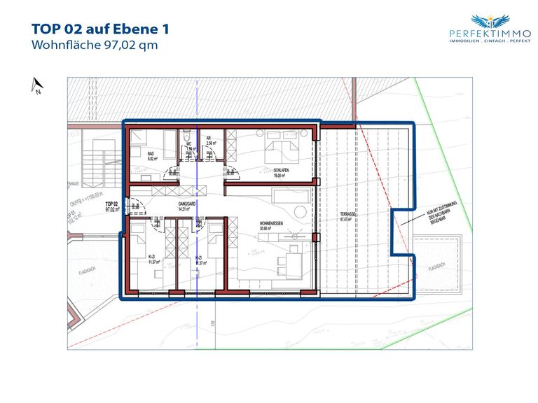 Auf der Ebene 1 liegen die Wohnungen Top 1 und Top 2. Beide Wohnungen verfügen jeweils über eine sehr großzügige Terrasse. Auch der allgemeine Technikraum befindet sich auf Ebene 1.