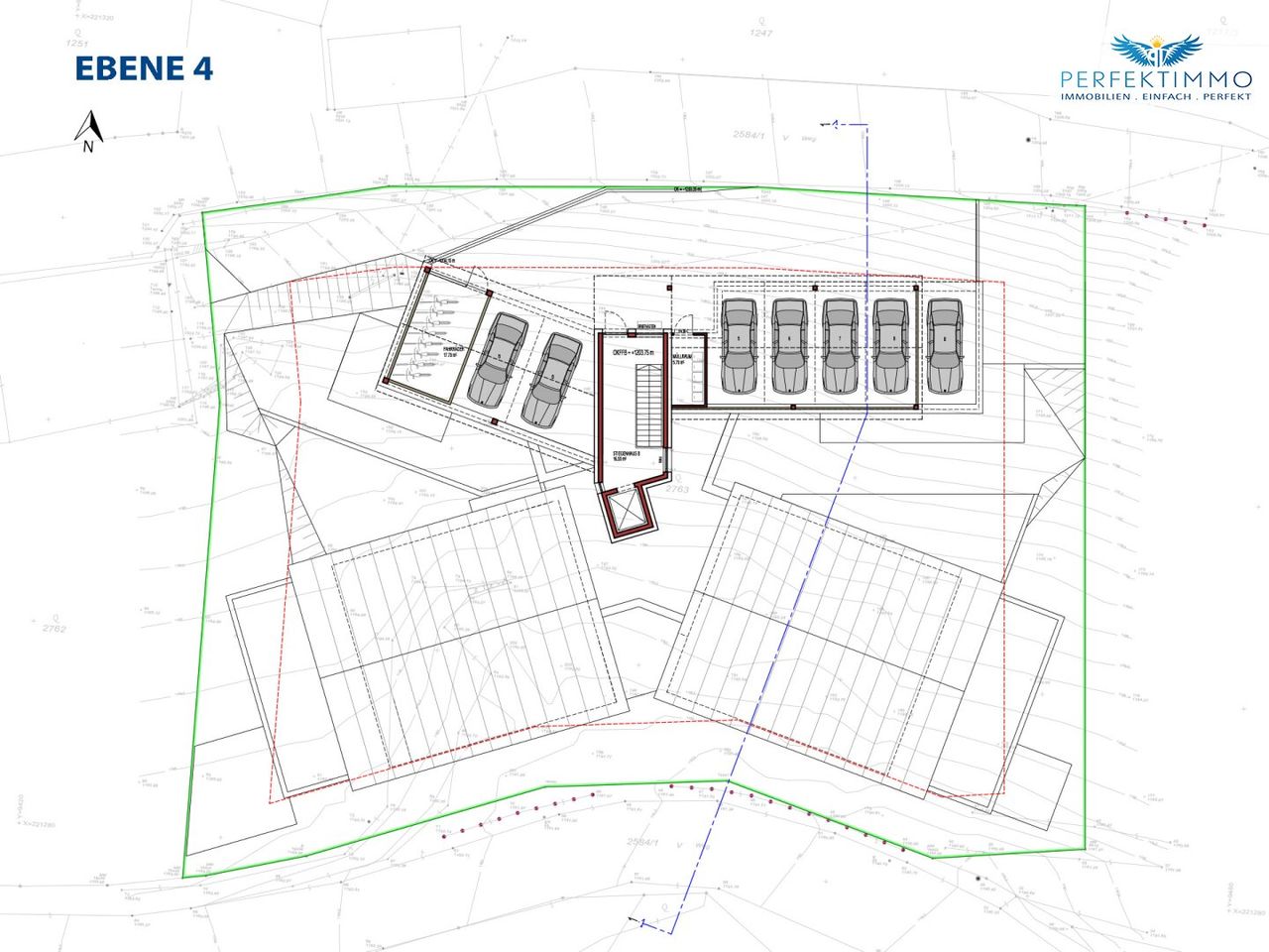 Auf Ebene 4 befinden sich vier den Wohnungen Top 5 bis Top 8 zugewiesene Stellplätze sowie drei Besucherparkplätze. Ein weiterer Fahrradraum und ein weiterer Müllraum sind hier ebenfalls vorgesehen. Die Briefkästen für die Tops 5 bis 8 befinden sich ebenfalls auf Ebene 4.