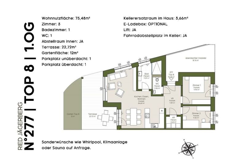 Zur Wohnung zählt zudem ein Carportabstellplatz und ein Parkplatz im Freien, die gesamt um € 25.000,- zusätzlich erworben werden können.