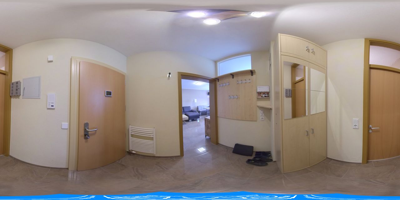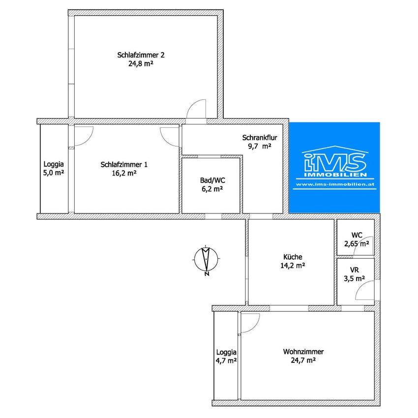Raumaufteilung: Vorraum, Gäste-WC, großzügiges Wohnzimmer (mit Zugang zur ersten Loggia), Küche, Gang, Schlafzimmer (mit Zugang zur zweiten Loggia), Schlafzimmer und Bad/WC.