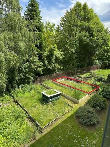 Der ostseitige Balkon ist mit Glastüren ausgestattet, die vollständig geöffnet werden können, und bietet einen schönen Ausblick in die Natur. Zusätzlich steht ein hausintern zugeteilter Gartenanteil zur Verfügung, der ideal für entspannte Stunden im Freien ist.