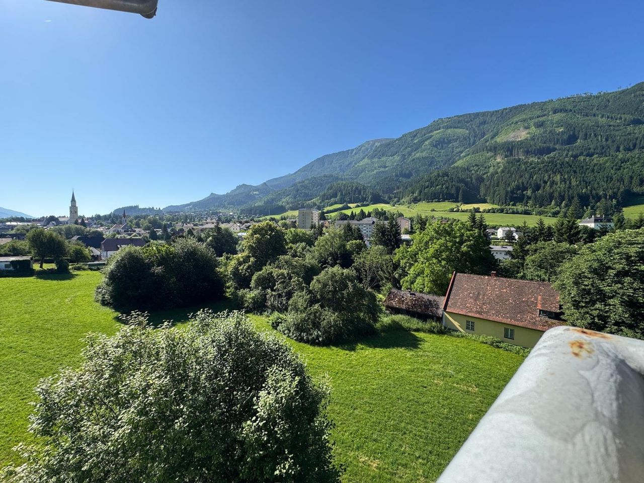 Über RE/MAX Nature zum Kauf angeboten wird eine gepflegte 3-Zimmer-Wohnung mit herrlichem Ausblick auf die umliegende Berglandschaft und die Stadt Rottenmann.