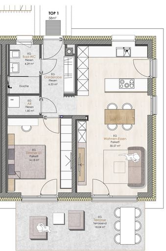 - Wohn-Ess-Küchenbereich: Großer, offener Bereich, der zum Verweilen einlädt und direkten Zugang zur südseitigen Terrasse bietet.