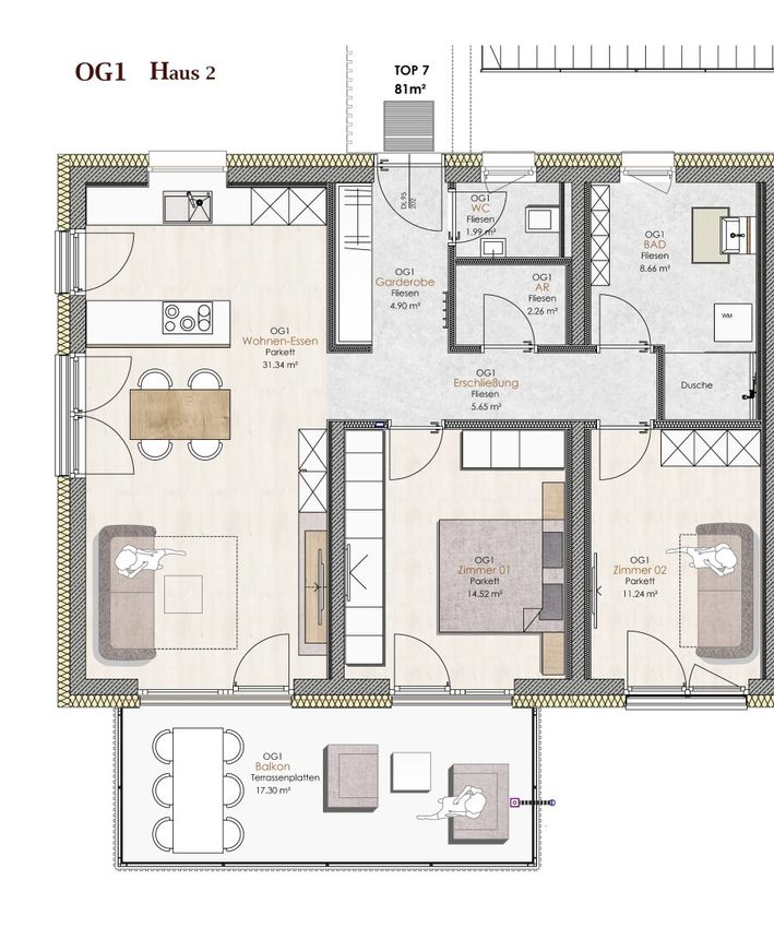 - Gang: Der zentrale Flur ermöglicht einen direkten Zugang zu allen Räumen und sorgt für eine optimale Raumaufteilung.