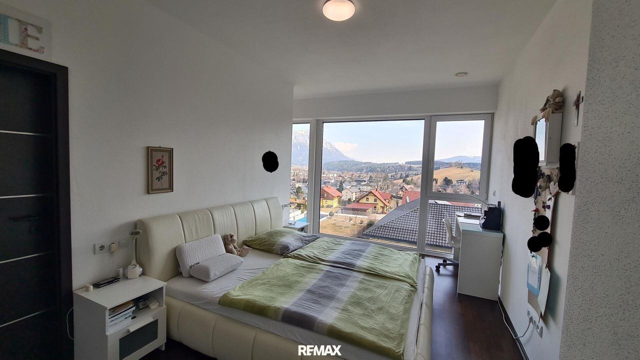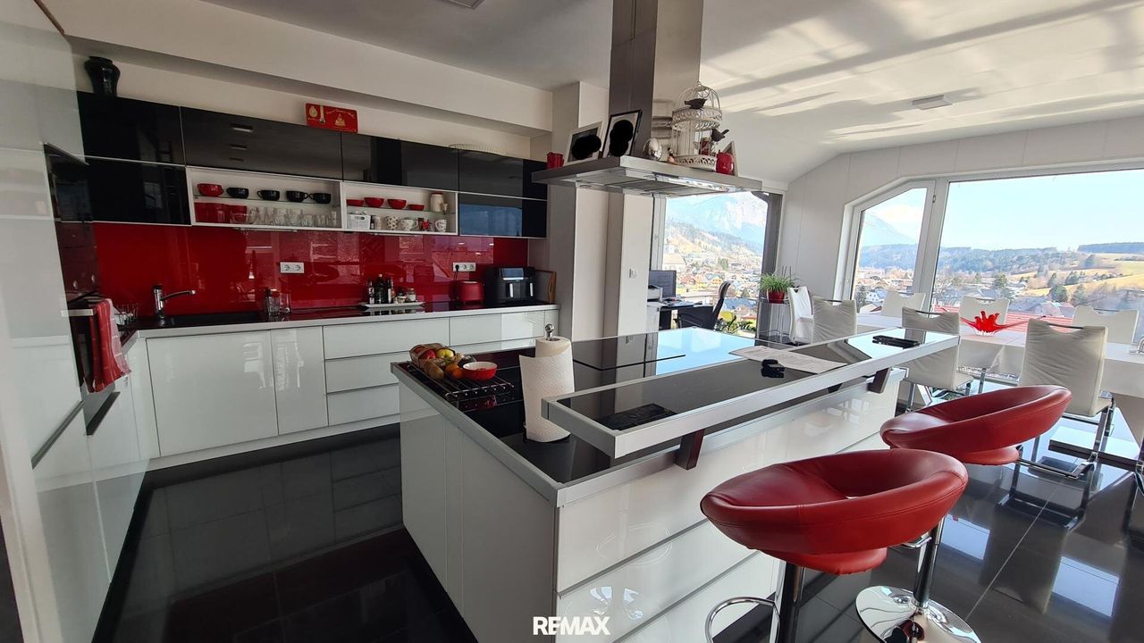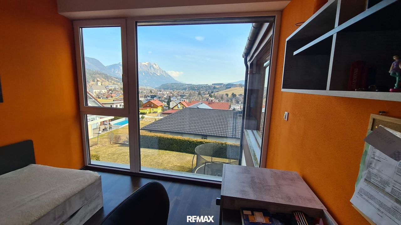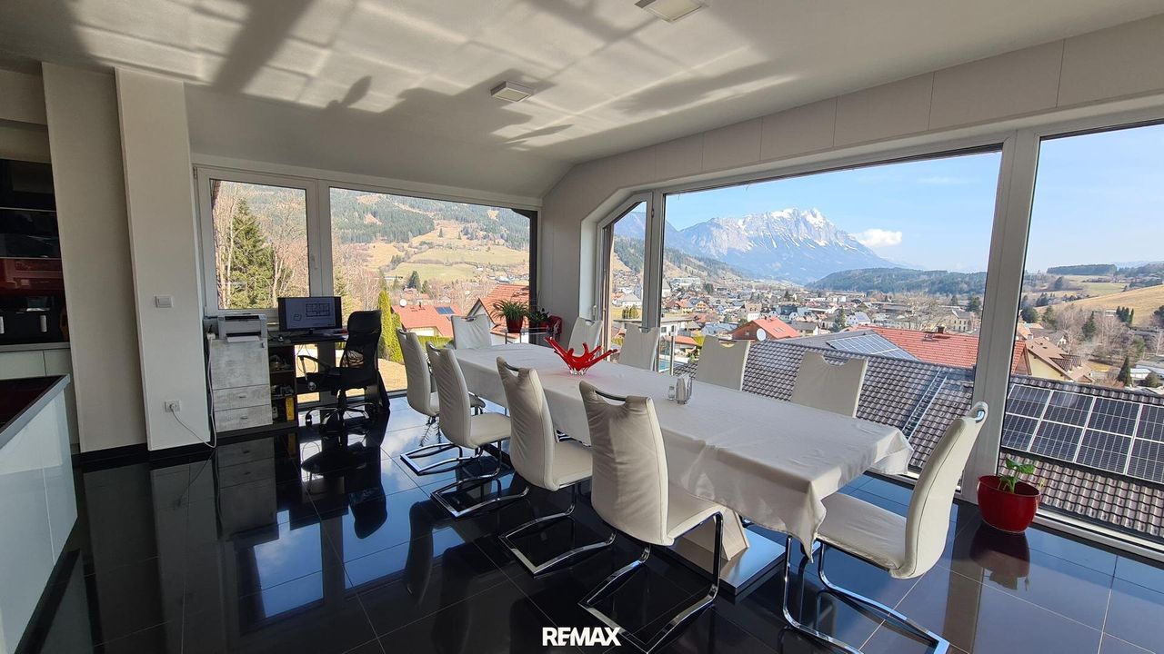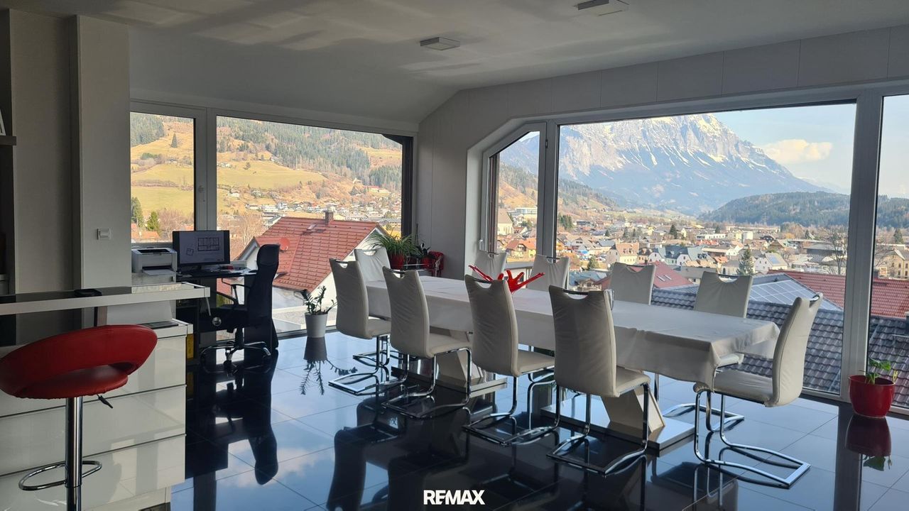 Bereits beim Betreten der Wohnung wird der offene und lichtdurchflutete Charakter spürbar. Der großzügige Wohn- und Essbereich bildet das Herzstück der Immobilie. Große Fensterflächen sorgen nicht nur für eine angenehme Helligkeit im gesamten Wohnraum, sondern eröffnen auch einen spektakulären 180-Grad-Panoramablick über Gröbming und die umliegende Landschaft. Die Kombination aus moderner Architektur und dieser einzigartigen Aussicht schafft eine besondere Wohnatmosphäre.
