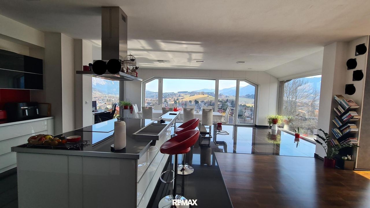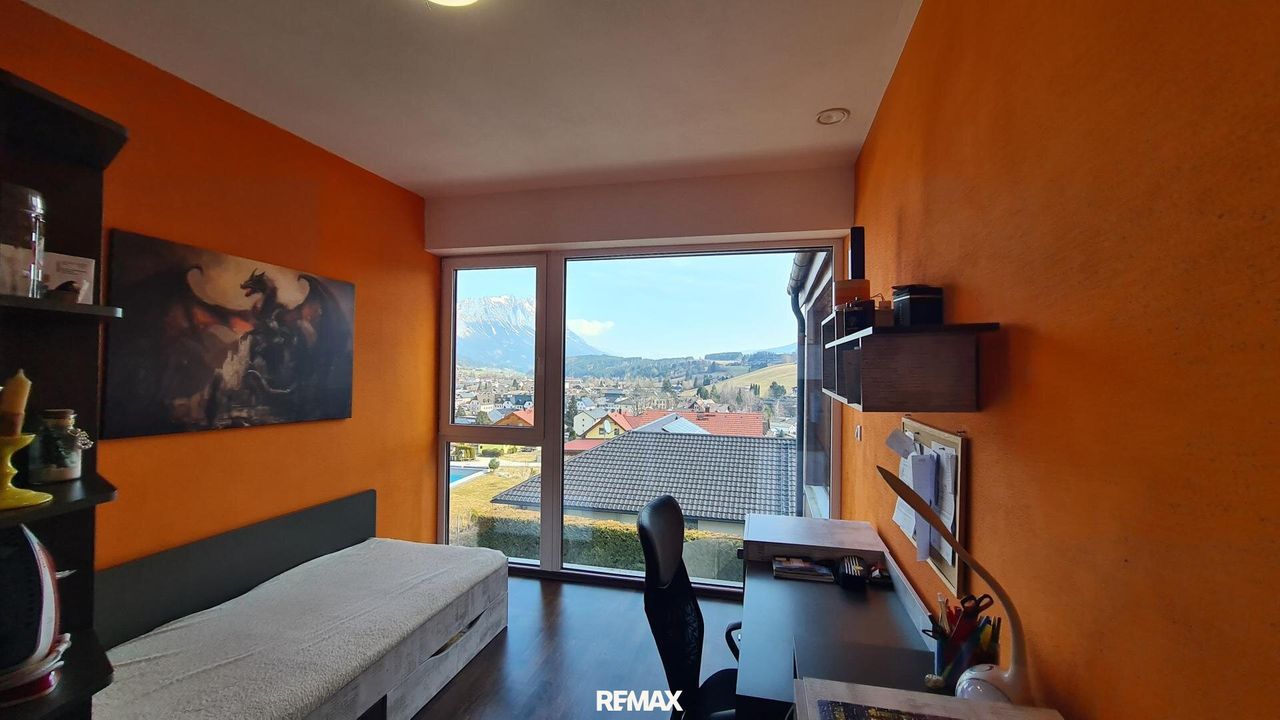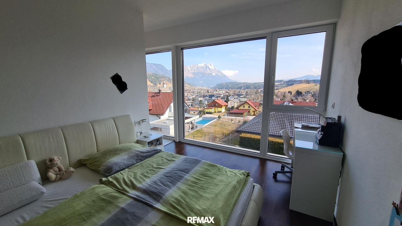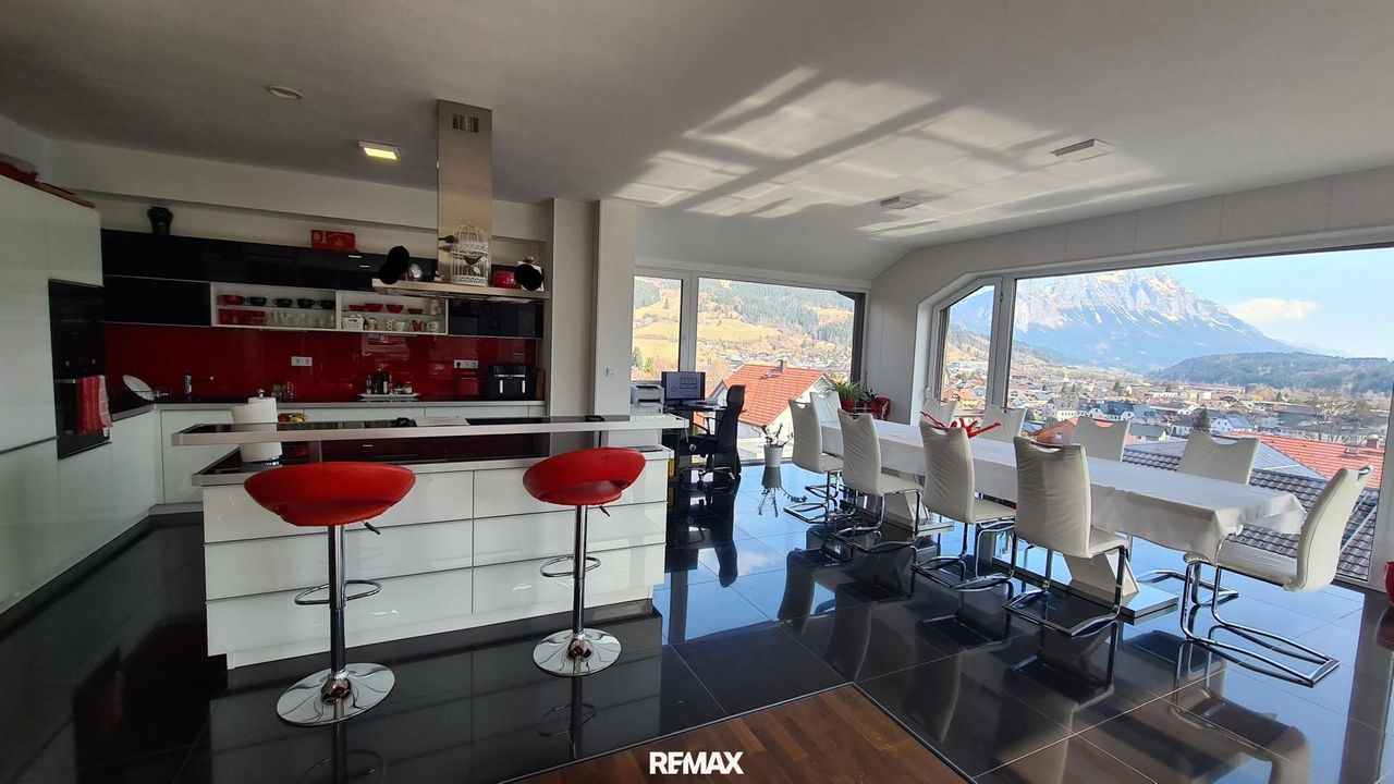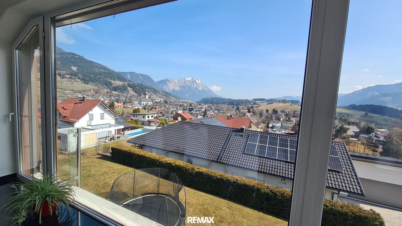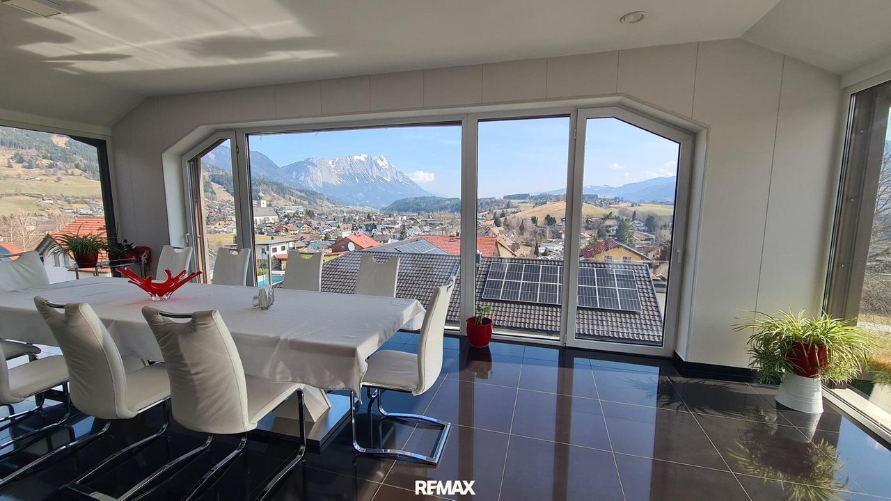 Bereits beim Betreten der Wohnung wird der offene und lichtdurchflutete Charakter spürbar. Der großzügige Wohn- und Essbereich bildet das Herzstück der Immobilie. Große Fensterflächen sorgen nicht nur für eine angenehme Helligkeit im gesamten Wohnraum, sondern eröffnen auch einen spektakulären 180-Grad-Panoramablick über Gröbming und die umliegende Landschaft. Die Kombination aus moderner Architektur und dieser einzigartigen Aussicht schafft eine besondere Wohnatmosphäre.