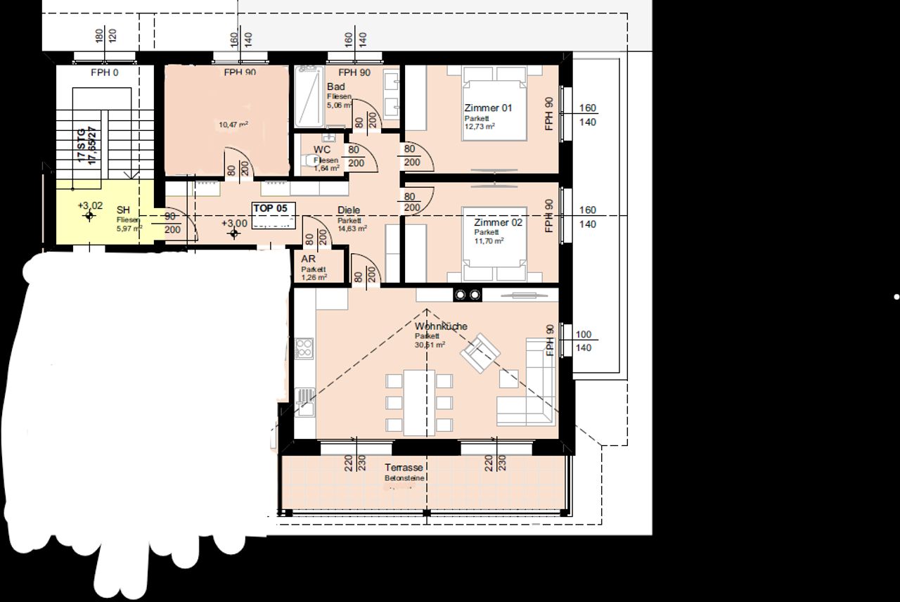 Die gegenständliche Wohnung TOP 5/2 ist im OG angesiedelt und hat bei einer Gesamtfläche von ca. 88,00m² folgende Raumaufteilung vorzuweisen: