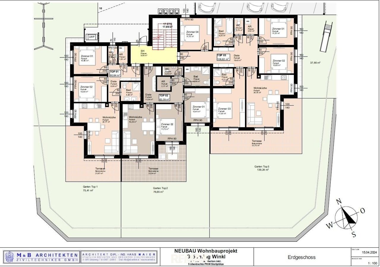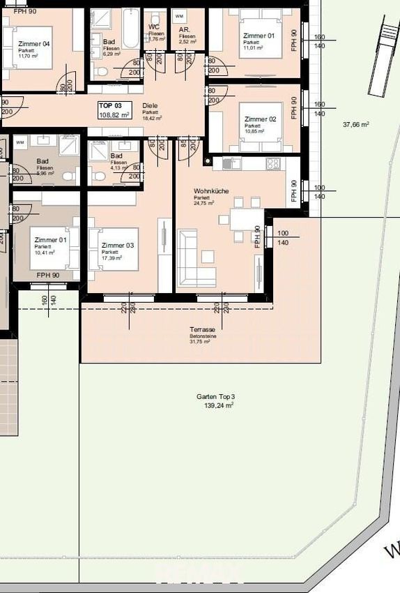 Die gegenständliche Wohnung TOP 3 ist im EG angesiedelt und hat bei einer Gesamtfläche von ca. 108,44m² folgende Raumaufteilung