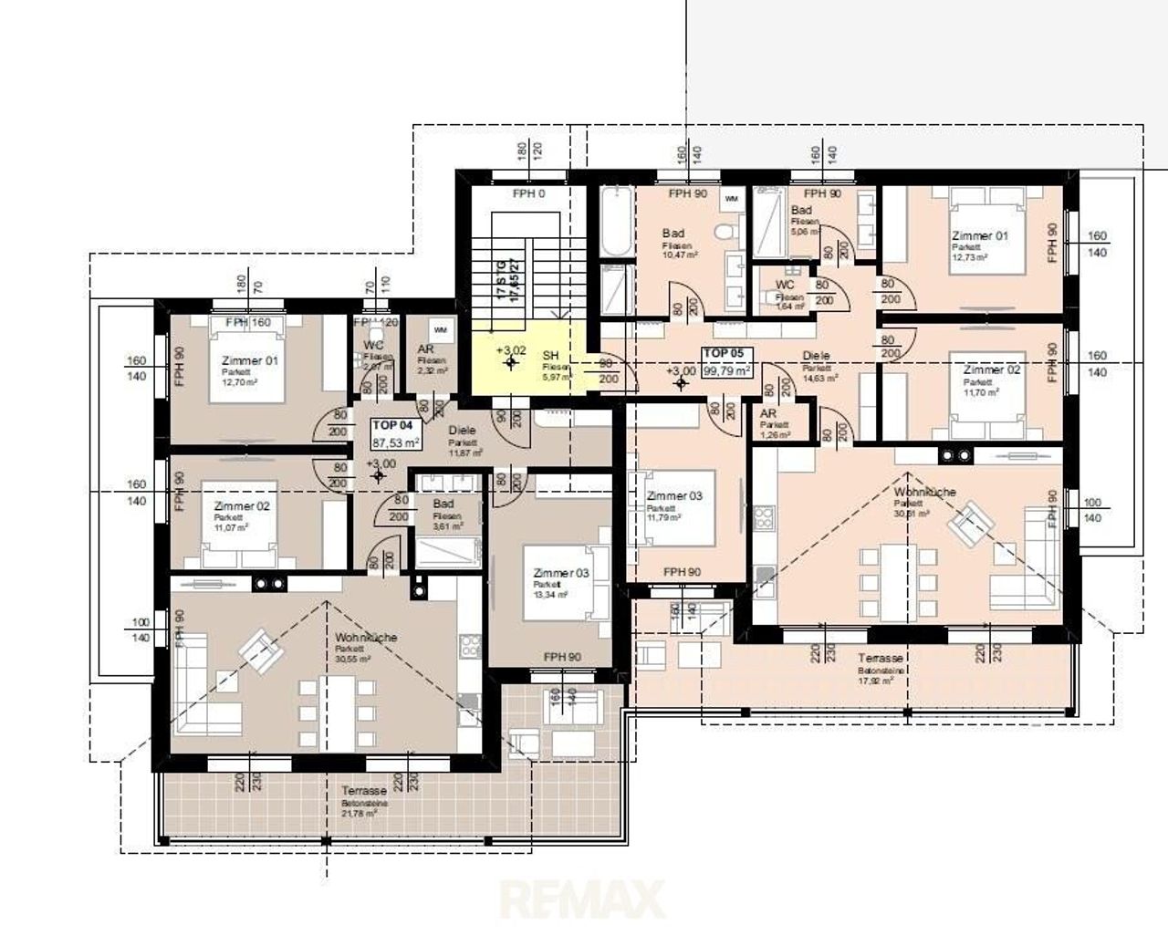 Die gegenständliche Wohnung TOP 5/1 ist im OG angesiedelt und hat bei einer Gesamtfläche von ca. 99,79m² folgende Raumaufteilung