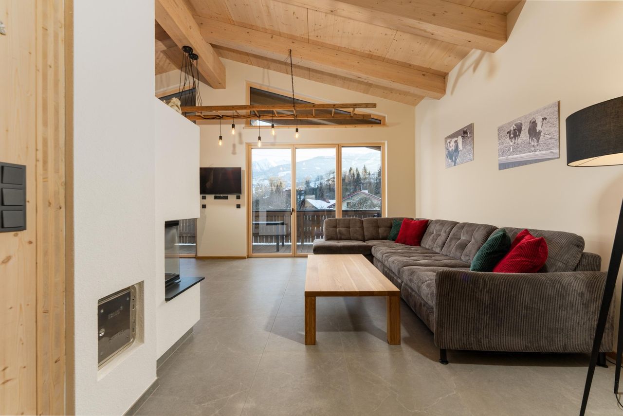 Der atemberaubende Blick auf das Bergpanorama des Hauser Kaibling und auf dem überdachten Südbalkon auf unberührte Wiesen lässt keine Wünsche offen.