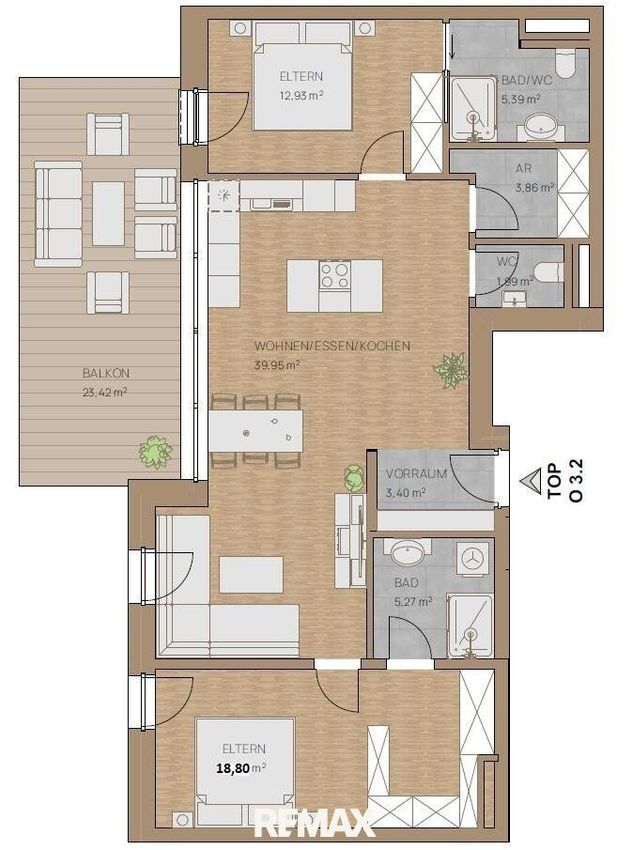 Die hier angebotene PENTHOUSE-Wohnung O 3.2 (Haus OST, 3.OG, Top 2) bietet eine Wohnfläche von ca.91,59m², dazu einen Balkon/Terrasse mit ca.23,42m², sowie zusätzlich ein großes Kellerabteil.