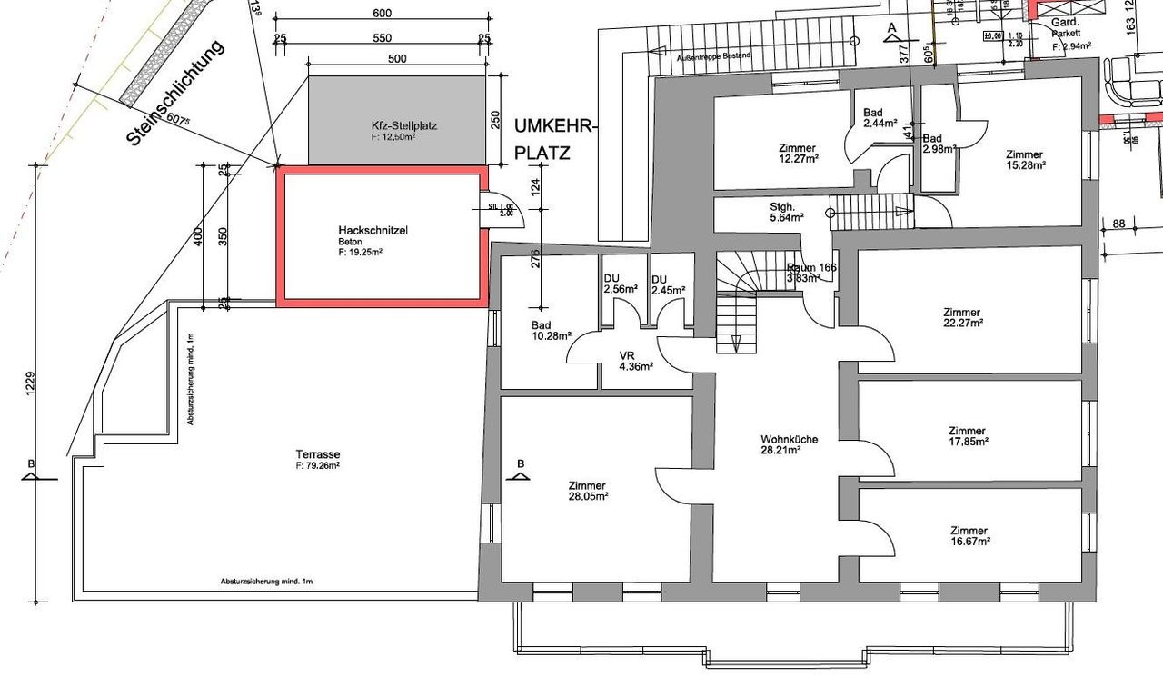 Zusätzlich besteht die Möglichkeit, eine ca. 80 m² große Westterrasse zu errichten. Die Einreichung hierfür samt positivem Baubescheid gibt es bereits.