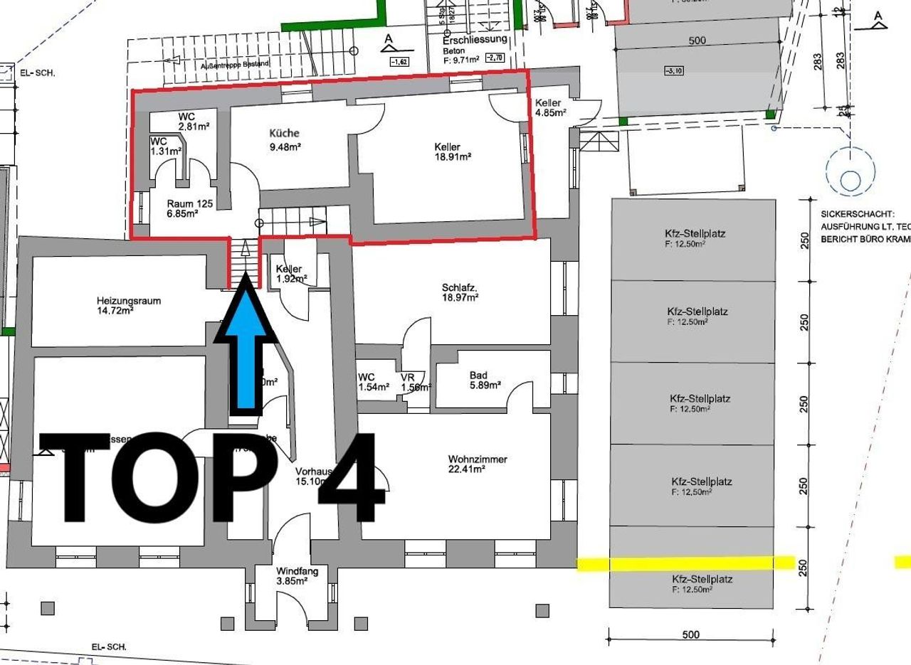 Insgesamt und der Wohneinheit vertraglich zugehörig gibt es 6 KFZ-Abstellplätze im Freien, welche in weiterer Folge aber noch final hergestellt werden müssen.