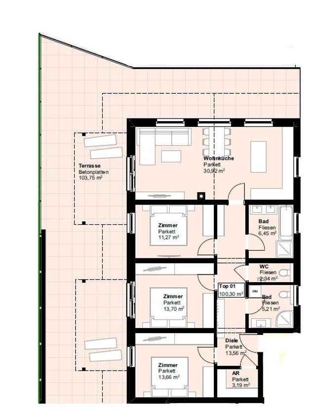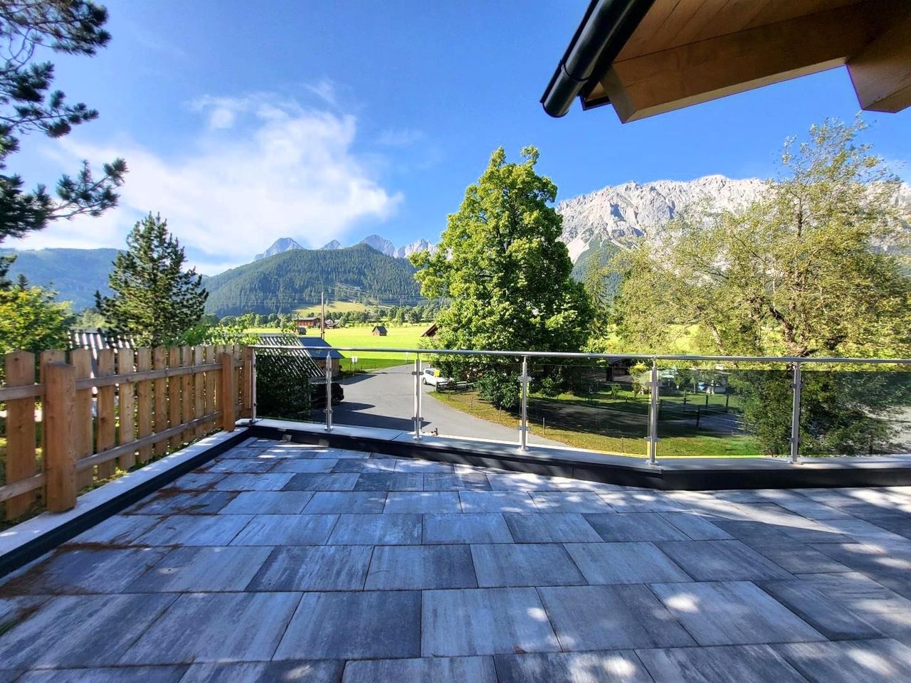 Auf kürzestem Weg gelangt man auf die gewaltige Terrasse mit knapp 104m², nach Westen und zum Dachstein hin ausgerichtet und einem wahren Traum gleich kommend.