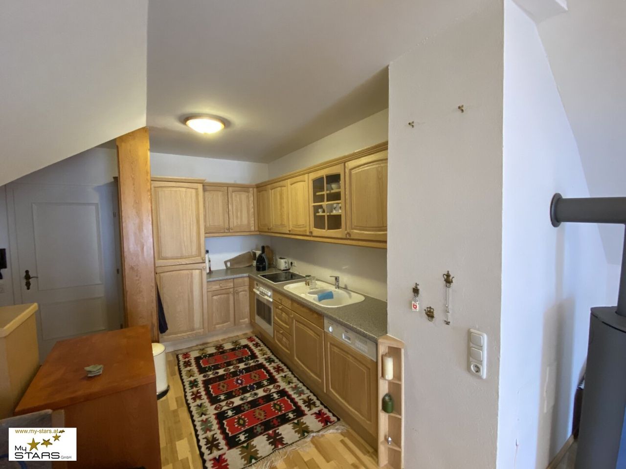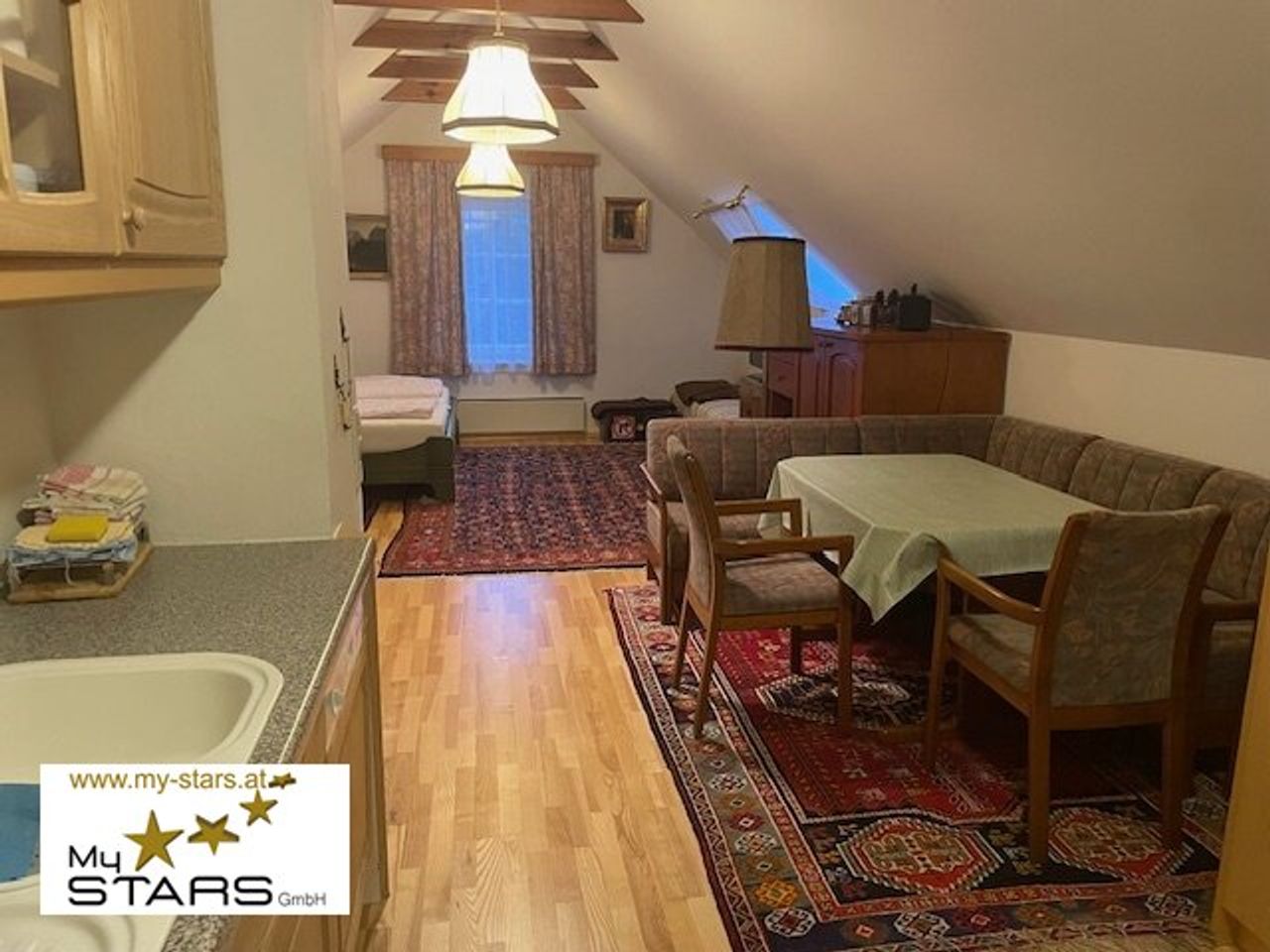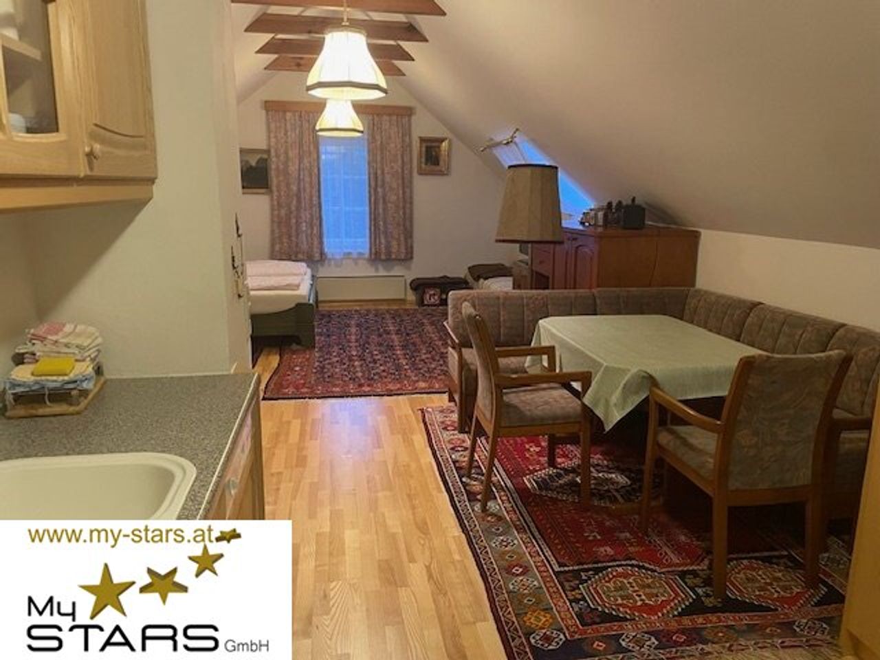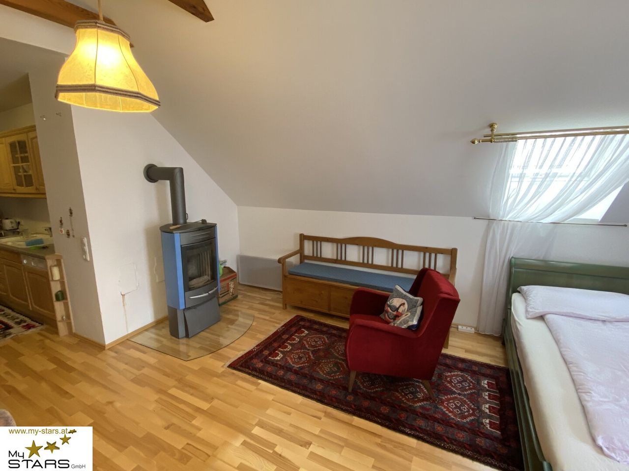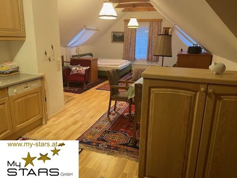 Der offen gestaltete Wohn- und Schlafbereich besticht durch hohe Räume, freigelegte Dachbalken und warme Holzoberflächen. Die stilvolle Einbauküche fügt sich dezent in das Raumkonzept ein. Ein modernes Badezimmer mit Dusche rundet das Angebot ab.