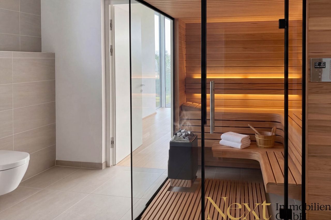 Das Schlafzimmer verfügt über ein eigenes, direkt angrenzendes Badezimmer samt Badewanne, Regendusche, Doppelwaschbecken sowie Toilette - ein Saunaanschluss ist ebenfalls vorhanden. Ein zeitloses und ansprechendes Design verleiht diesen Räumlichkeiten einen besonderen Charme.