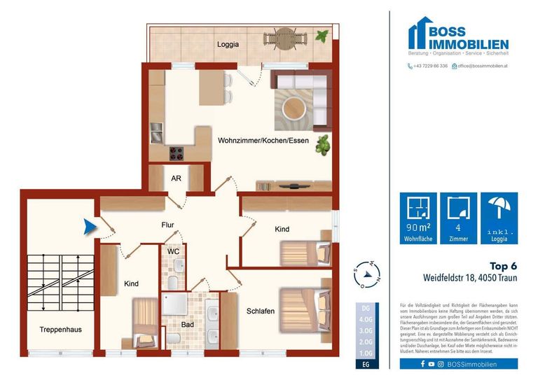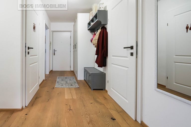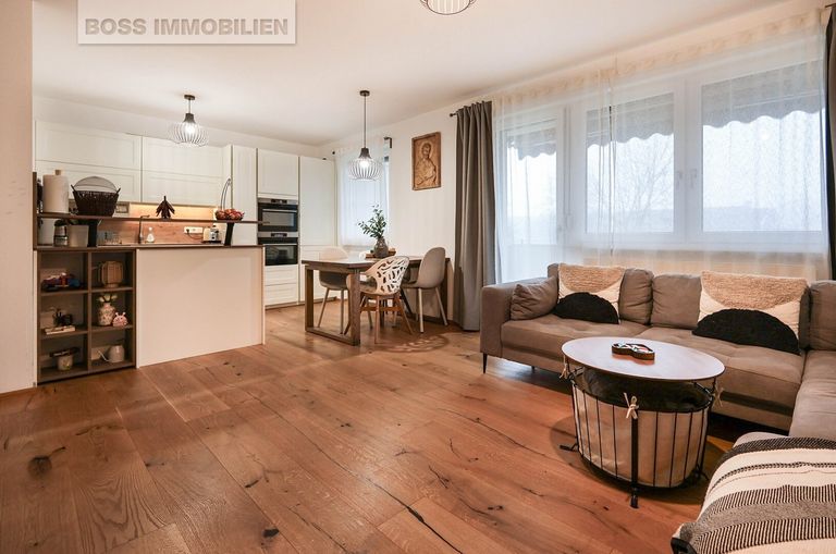 Das Herzstück der Wohnung ist der großzügige Wohnbereich mit direktem Zugang zur sonnigen Loggia – perfekt, um entspannte Stunden im Freien zu genießen. Große Fensterflächen durchfluten die Räume mit Tageslicht und schaffen ein helles, einladendes Wohnambiente.