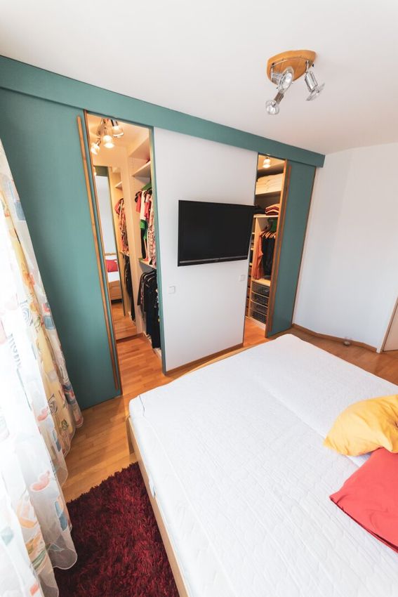 Im Schlafzimmer bieten zwei versteckte Einbauschränke ausreichend Platz für Ihre Kleidung.