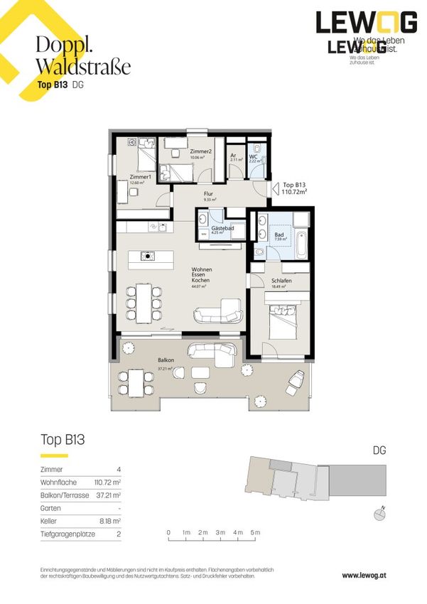 Diese Wohnung besticht durch ein durchdachtes Wohnkonzept mit einem großzügigen Wohn-Essbereich (44 m²), einem komfortablen Schlafzimmer (18 m²) samt Badezimmer mit Badewanne, Dusche, Doppelwaschtisch und separatem WC. Für Kinder oder Gäste steht ein eigenes Badezimmer sowie ein zusätzliches WC zur Verfügung. Vorbereitungen für einen nachträglichen Einbau einer Klimaanlage werden getroffen. Der 37 m² große Balkon lädt zu entspannten Stunden mit Familie und Freunden ein und bietet einen herrlichen Gebirgsblick.