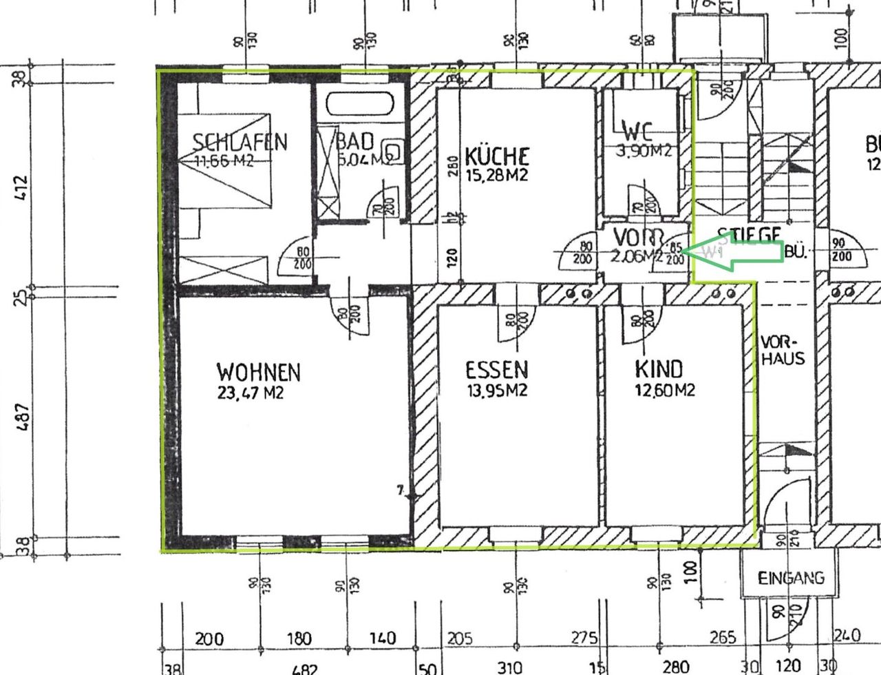 Die großzügige Wohnfläche von 88 m² teilt sich auf einen kleinen Vorraum mit Garderobe und WC, sowie der zentral gelegenen Küche, 3 geräumige Zimmer und einem separaten Bad mit Wanne, WM-Anschluss und Fenster auf. Die Küche bietet mit ca. 15 qm ausreichend Platz zum Kochen und einen gemütlichen Essbereich.