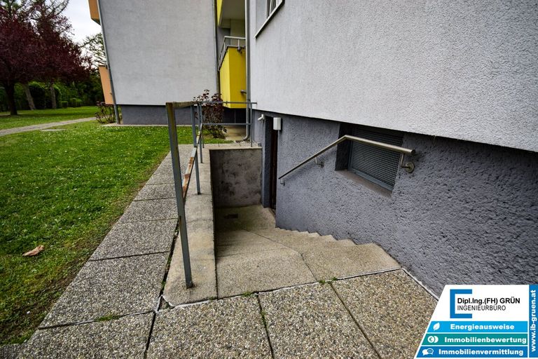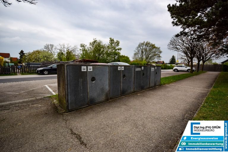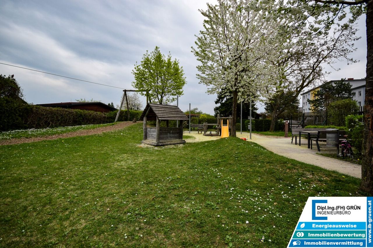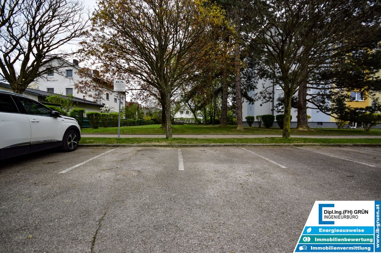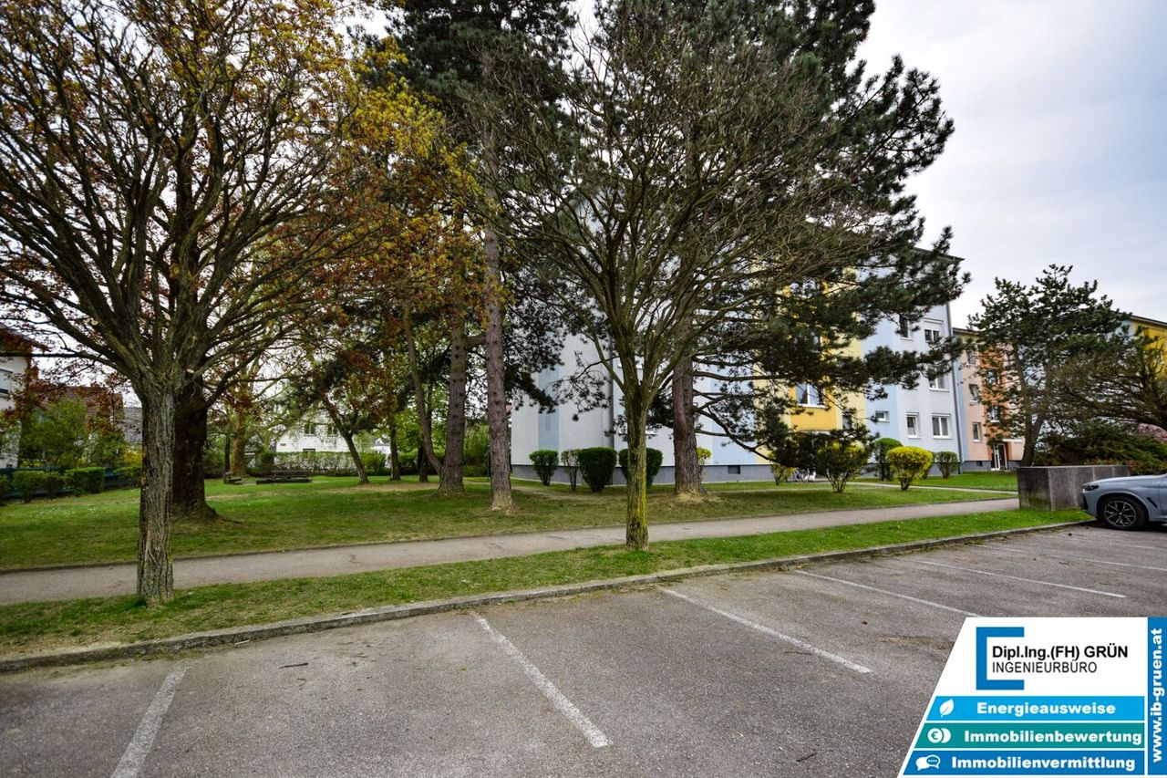 Zur Wohnanlage gehört eine sehr große Grünfläche, die für ein angenehmes und offenes Wohngefühl sorgt. Vor dem Haus stehen den Bewohnern Parkplätze der Wohnanlage zur Verfügung. Diese sind zwar nicht fix zugeteilt, in der Praxis ist jedoch in der Regel ausreichend Parkmöglichkeit vorhanden. Zusätzlich kann entlang der Straße problemlos geparkt werden.