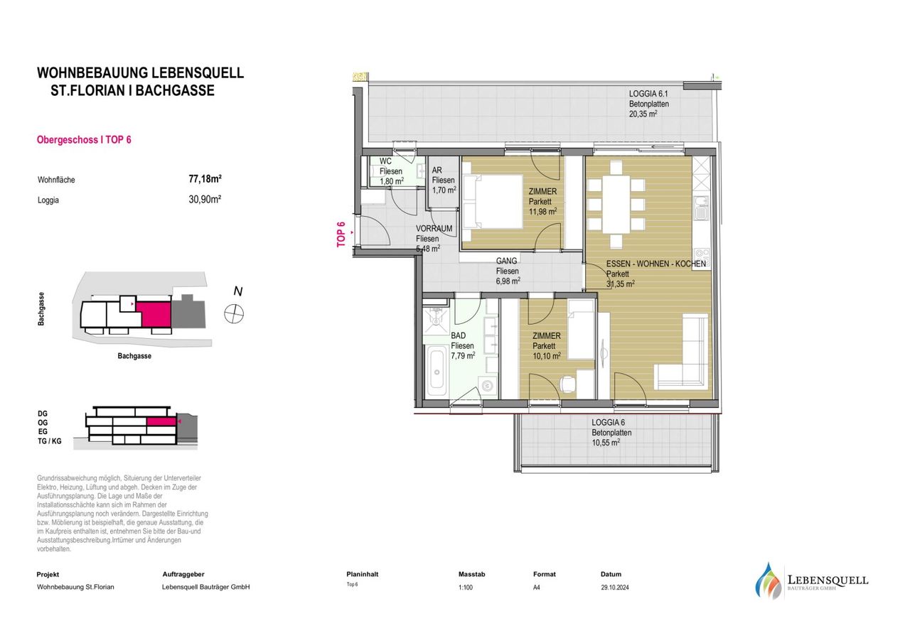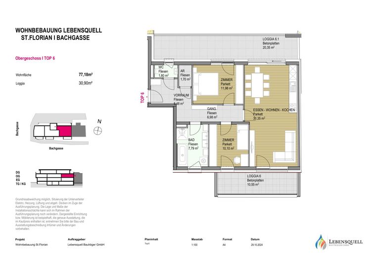 In ruhiger Zentrumslage von St. Florian wird der 2. Bauteil des Projektes "Grüner Baum" realisiert. Das attraktive, moderne Mehrfamilienhaus mit insgesamt 8 Wohneinheiten bietet maximalen Wohnkomfort mit durchdachter, zeitgemäßer Raumplanung. Besonderen Wert wird neben der hochwertigen Ausstattung auf eine verbesserte Energieeffizienz gelegt. Die Wohnung Top 6 liegt wunderschön ausgerichtet im 1. Obergeschoß mit Blick nach Ost, Süd und Nordwest. Die Dreiraumwohnung verfügt über eine sehr gelungene Raumaufteilung mit viel Helligkeit und Tageslicht in den einzelnen Räumen. Einzigartig sind 2 Außenflächen - eine Loggia für die Vormittagssonne und eine chillige Loggia für die Abendstimmung schaffen Freiraum und Lebensqualität.
