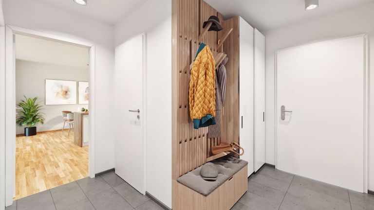 Die Wohnung verfügt über 3 weitere Zimmer, einer Garderobe im Eingangsbereich, Vorraum, sowie ein Bad, WC und einen Abstellraum.