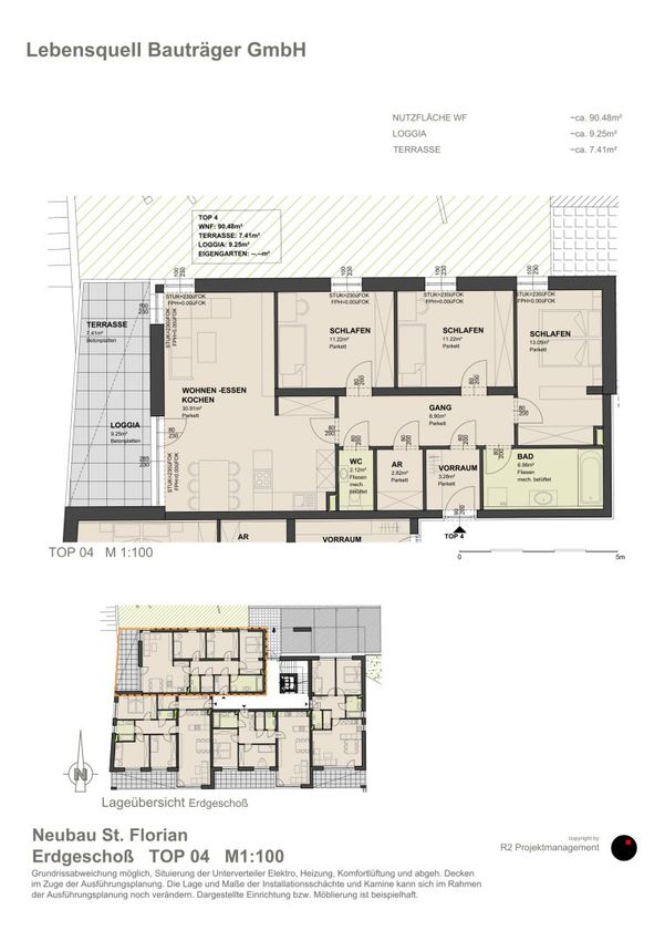 ERSTBEZUG - familienfreundliche 4-Zimmer Wohnung im Herzen von Sankt Florian mit Tiefgarage mit Lift. Linzer Straße 11a, Bachgasse / TOP 4, liegt im ruhigen Innenhof, im Erdgeschoß mit südwestlich ausgerichteter Loggia und angrenzender Grün- bzw. Spielfläche. Die Wohnung ist standardmäßig hochwertig mit Parkettböden, Großformatfliesen und elektrischem Sonnenschutz ausgestattet! Der großzügige Küchen- und Wohnbereich ist nach Südwesten hin ausgerichtet mit einer traumhaft großen Loggia/Terrasse.