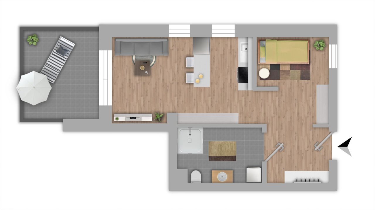 - Garderobe - Bad/WC - Wohnraum/Küche/Schlafen - Terrasse