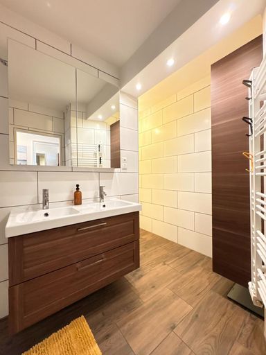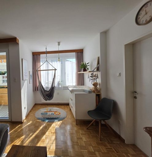 Unterteilt wird diese in einen offenen Wohn-Essbereich mit Zugang zum Balkon, eine angrenzende Küche, ein Schlafzimmer, ein Kinderzimmer, großzügiger Vorraum, Badezimmer mit Toilette sowie einen Abstellraum. Das Badezimmer wurde mit einer großzügigen, barrierefreien Dusche und einem Handtuchheizkörper ausgestattet, genügend Platz für eine Waschmaschine und einen Trockner runden das Angebot ab.
