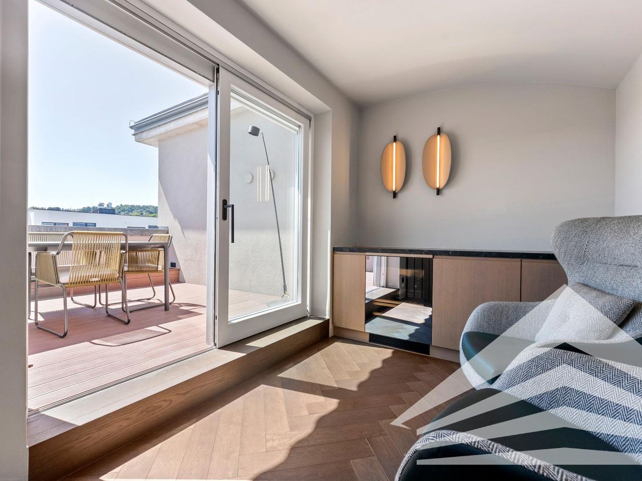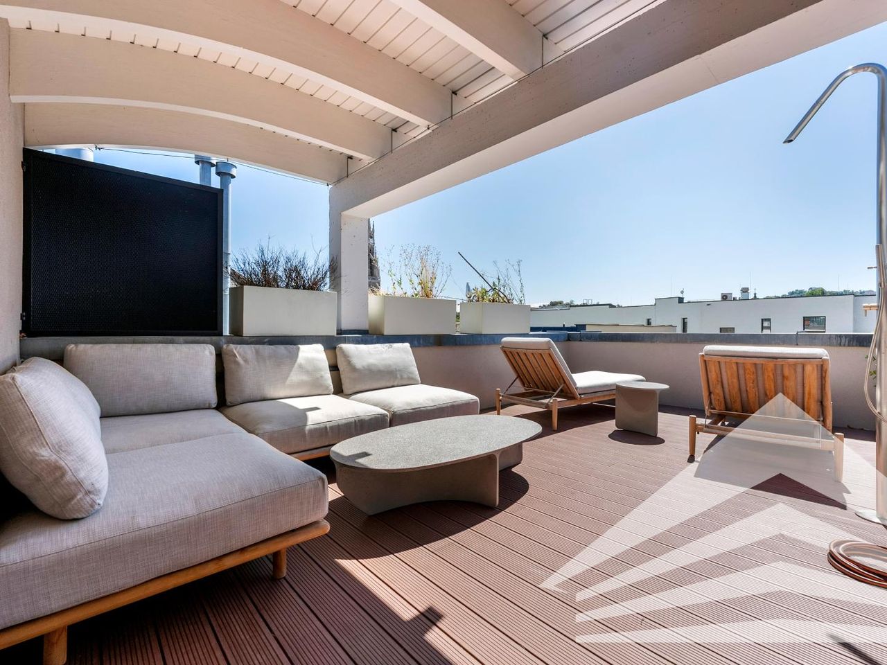 Sie haben noch nicht genug von so vielen Superlativen? Dann wartet das eigentliche Highlight auf der dritten Ebene der Wohnung noch auf Sie: die traumhaft sonnige Dachterrasse mit sensationellem 180-Grad-Ausblick auf den Linzer Mariendom, den Froschberg und den Pöstlingberg mit dem Linzer Wahrzeichen. Neben Sonnenschutz und Dusche sorgt ein edler Weinschrank in einem praktischen Regal für kühle Erfrischungen bei heißen Temperaturen.