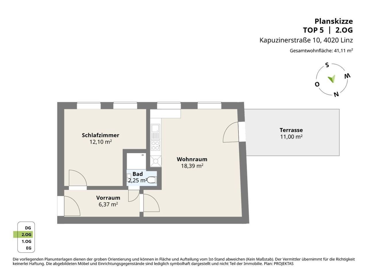 Raumaufteilung der Wohnung 5 mit ca. 41,11 m² Wohnfläche: