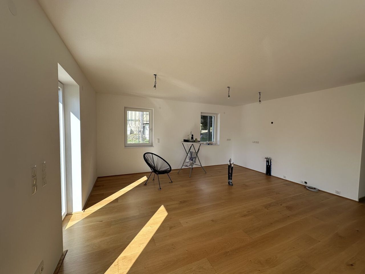 Das Herzstück der Wohnung ist zweifelsohne der offene, ca. 44,4 m² große Wohnbereich, der Kochen, Essen und Wohlfühlen vereint. Durch die Hebeschiebetüre gelangen Sie von hier aus auf die 37,20 m² große Terrasse und den Eigengarten.