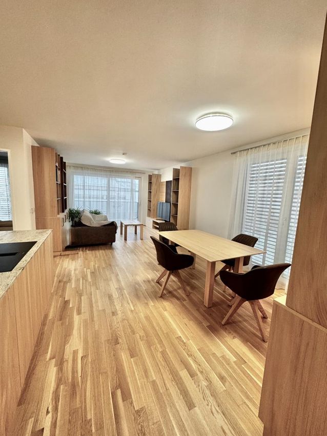 Die lichtdurchfluteten Räume schaffen in Kombination mit edlen Parkett- und Fliesenböden eine warme und einladende Wohnatmosphäre. Raumhohe Schiebetüren unterstreichen das moderne, großzügige Wohngefühl.