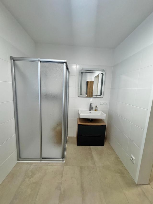 Das Badezimmer präsentiert sich großzügig und stilvoll mit Badewanne, Dusche und Tageslicht. Ergänzt wird das Raumangebot durch ein separates WC sowie einen Abstellraum.