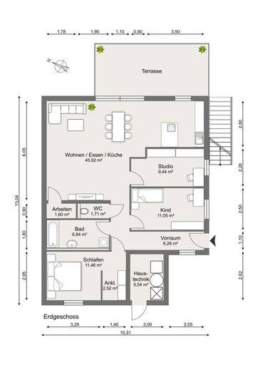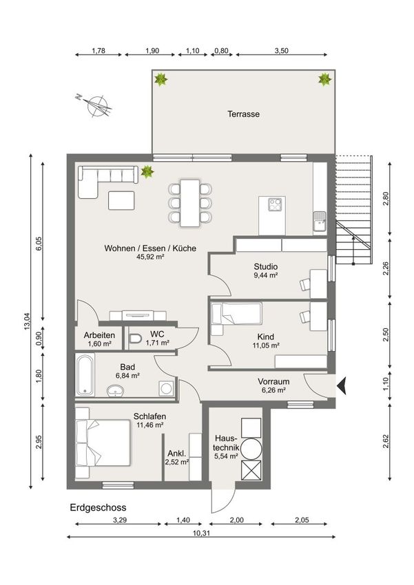 Im Preis ab 450.000,-- ist eine Gartenfläche von ca. 70m² mit Terrasse und Gartenhaus bereits inklusive. Eine größere Gartenfläche ist derzeit mit Aufpreis noch möglich bis ca. 250 m².