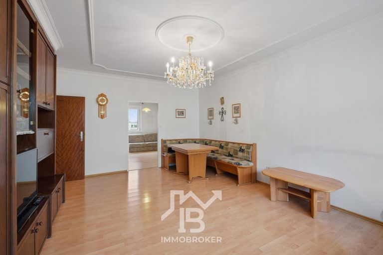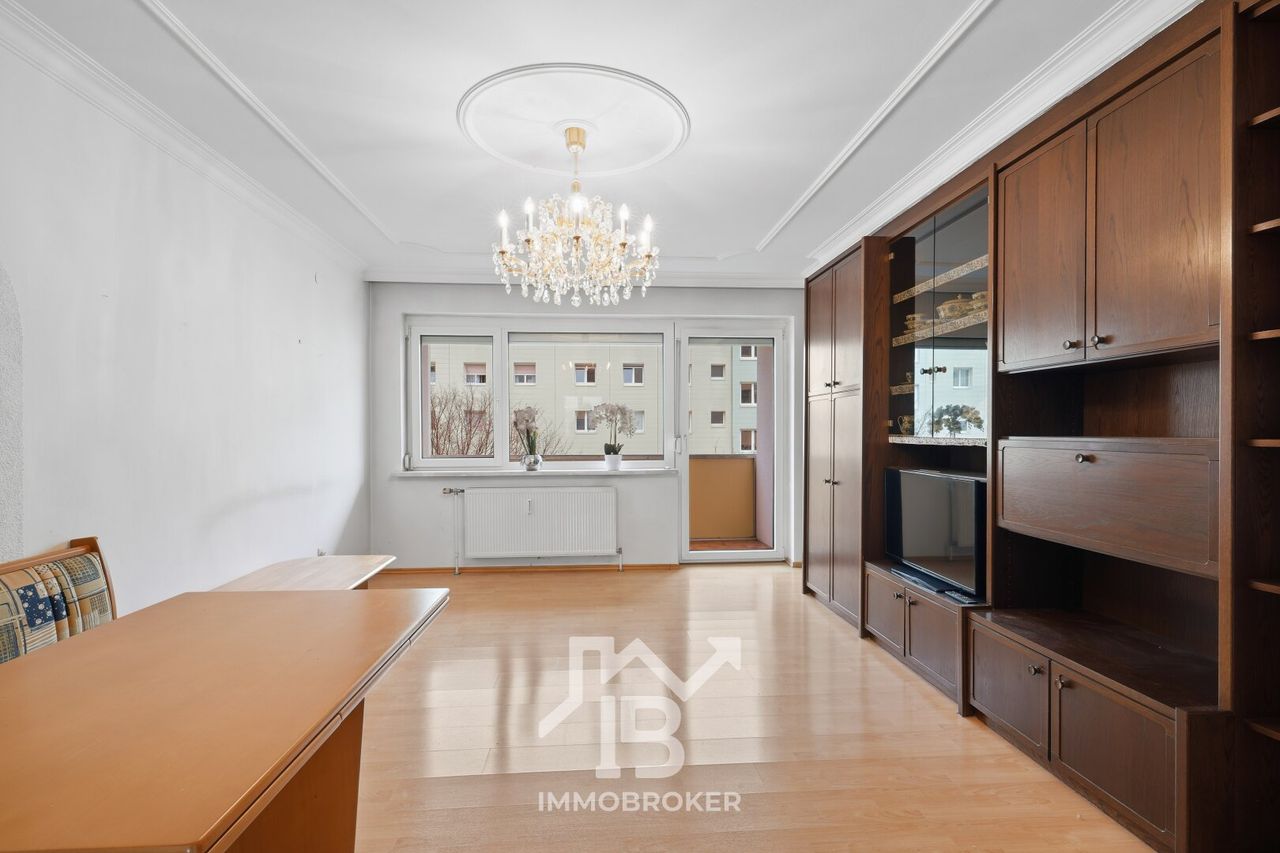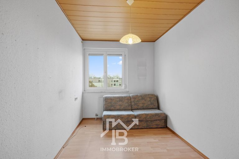 Der großzügige Wohnbereich bietet ausreichend Platz für eine gemütliche Wohn- und Esssituation und punktet mit großen Fensterflächen, die für eine angenehme natürliche Belichtung sorgen. Von hier aus gelangt man auf die Loggia, die zusätzlichen Freiraum im Alltag schafft.