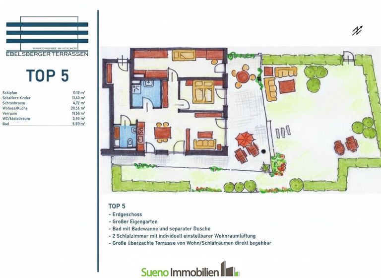 * durchdachte Planung, barrierefrei mit großzügigen Freibereichen (Terrasse und Garten)