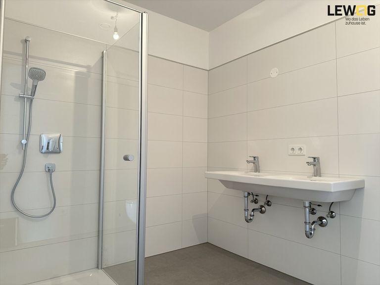 Bad und WC sind getrennt. Das WC verfügt über ein eigenes Handwaschbecken mit Kalt- und Warmwasseranschluss. Das Badezimmer ist mit einer Dusche (90x90 cm), einem Doppelwaschtisch, einem extra WC sowie einem Waschmaschinenanschluss ausgestattet. Im angrenzenden Abstellraum befindet sich die zentrale Wohnraumlüftung.