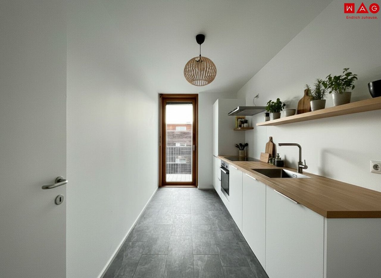 - Der Wohnbereich ist hell und freundlich – hier genießen Sie viel Licht und direkten Zugang zum Balkon. Die angrenzende separate Küche bietet nicht nur Platz zum Kochen, sondern ebenfalls Zugang ins Freie.