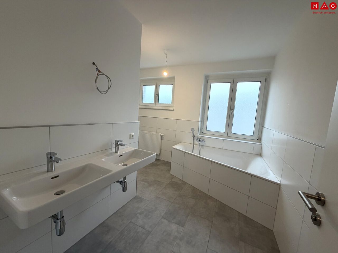 - Badezimmer mit Dusche, Badewanne, Doppelwaschbecken und Fenster